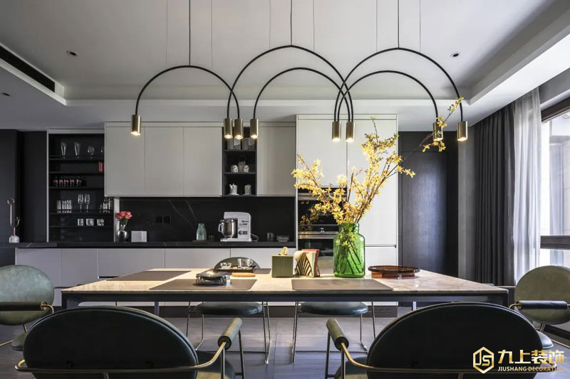 餐廳、西廚與吧臺融為一體,打造無拘束的社交型廚房。吧臺作為客廳與餐廳的自然劃分,讓兩個空間有所銜接,不至于空空蕩蕩。