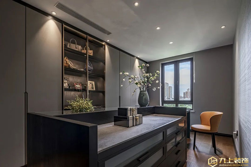 博洛尼全屋定制衣帽間,烤漆、金屬與玻璃的搭配,島臺與梳妝臺融合,演繹經(jīng)典的輕奢時尚。