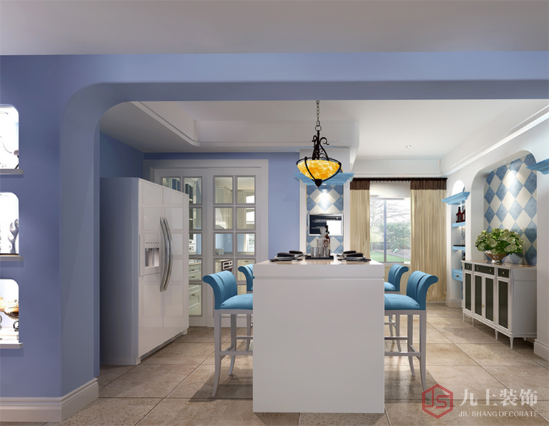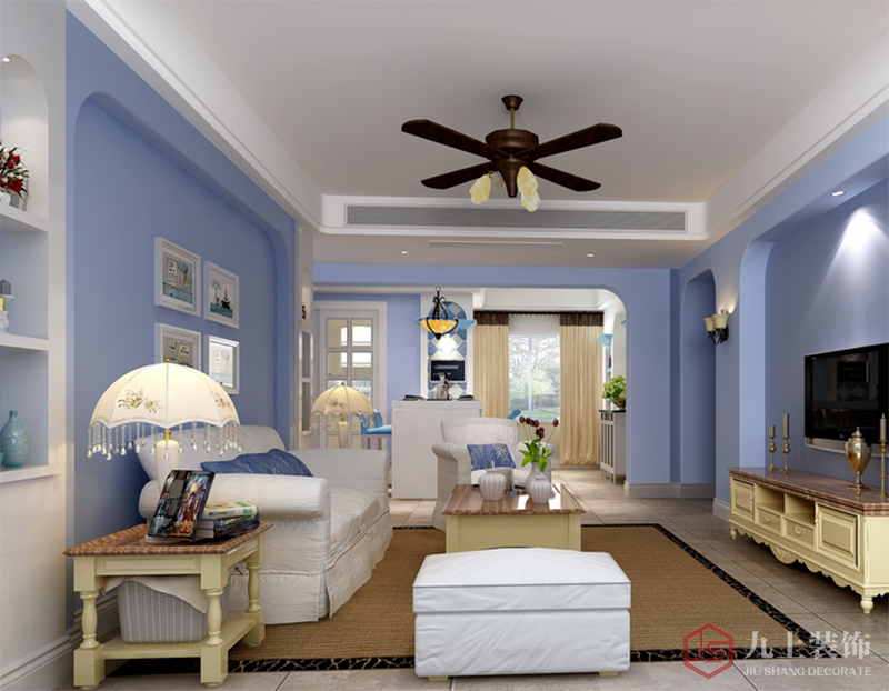 客廳墻面的拱形造型,簡潔的吊頂增加了整個空間的層次性,大面積的藍白色給人一種清新自然的感覺。