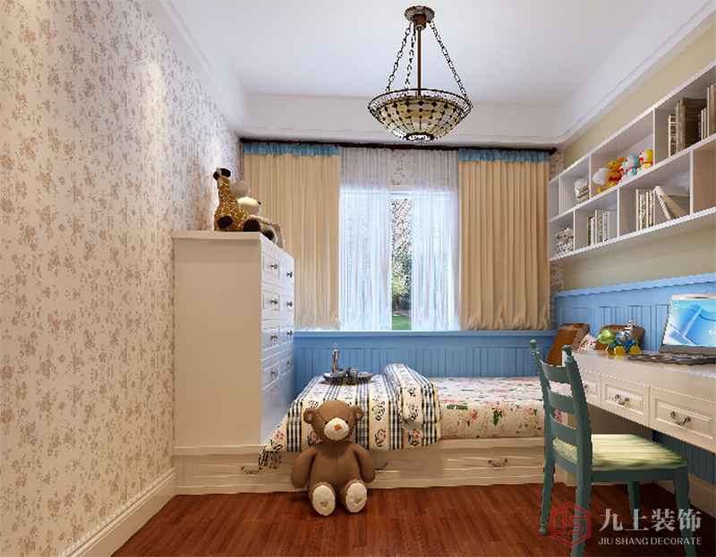 女兒房采用榻榻米的設(shè)計,節(jié)約的空間正好可以當做學(xué)習(xí)空間,而且還增大了整個活動空間。整個色彩上也是采用地中海的經(jīng)典配色,只是增加了一面墻的小碎花壁紙,使整個女兒房充滿活力、靈動。