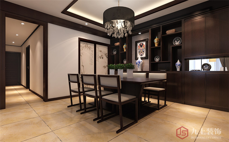 后面墻上的畫卷,木質(zhì)的桌面和中式的靠椅等等,塑造出了現(xiàn)代而有韻味的用餐