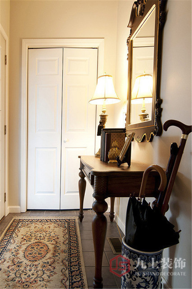 尋到這張窄長的邊桌,正好應(yīng)用于長長的過道。鑲上古典的玄關(guān)鏡和壁燈,讓過道也透露出一絲典雅氣