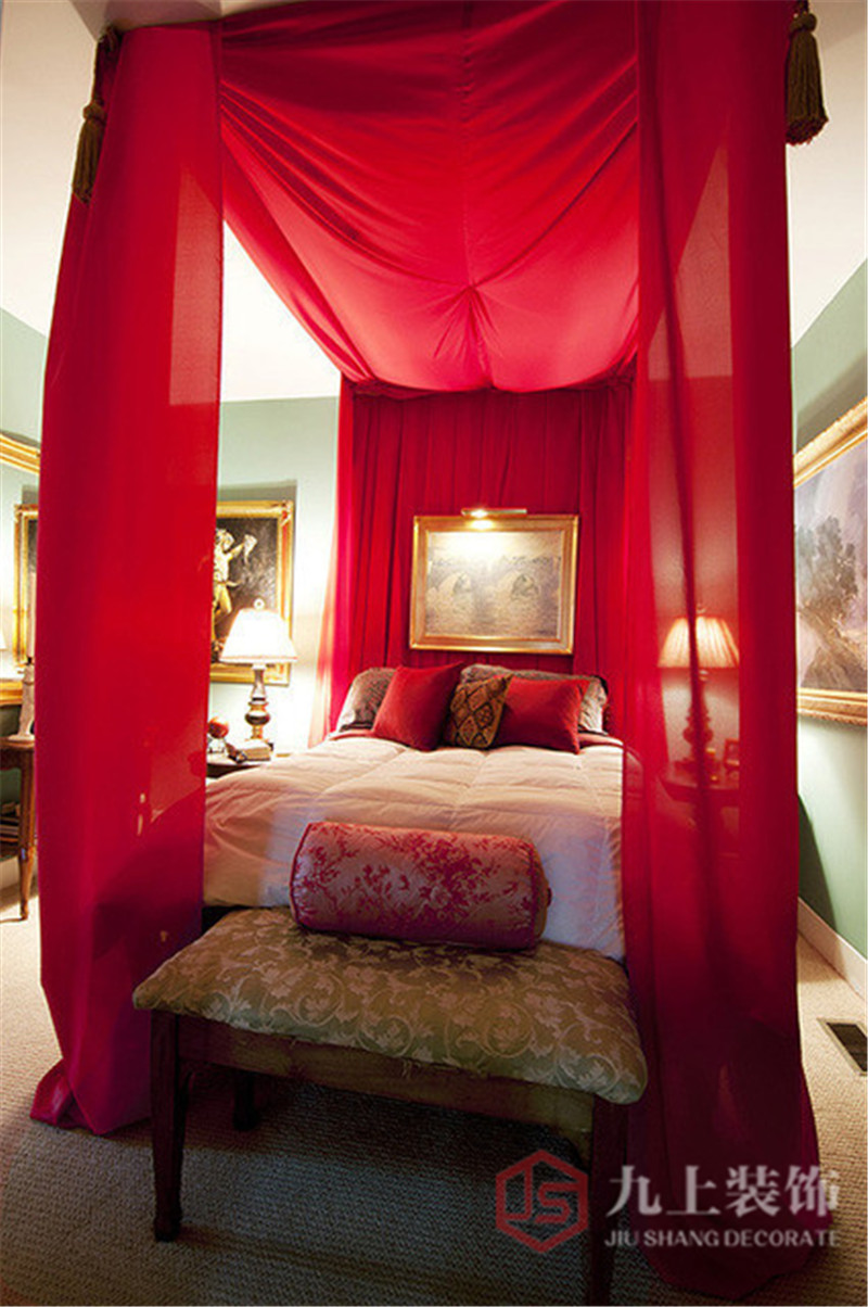 獨(dú)特定制的雙人床,以紅色為主題,蚊帳透露出朦朧的美感,有種婚房的感覺