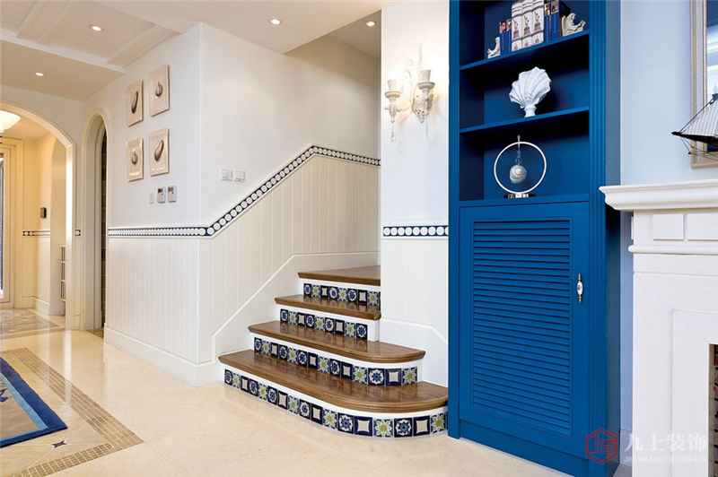 階梯立面用了藍色花磚,階梯正面則使用土黃色人造石面,與兩邊的白色墻體形成鮮明對比。