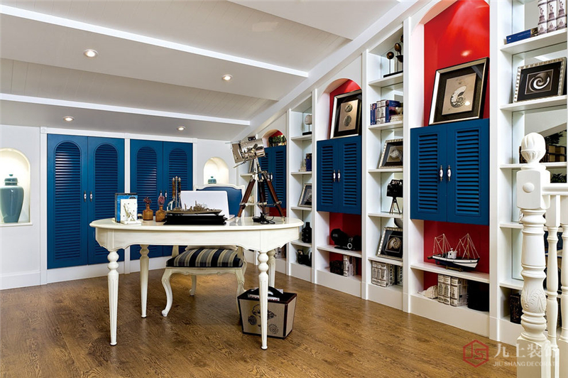 書房設(shè)計了很多柜子,方便收納,各種擺件也以海洋元素為主。