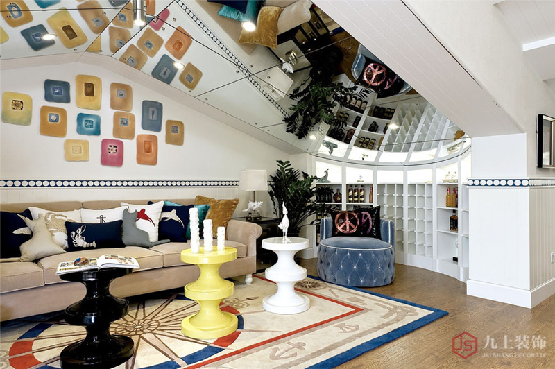 抱枕圖案都是海洋生物,地毯圖案為船錨和舵盤,屋頂?shù)蹴斢昧绥R面,空間感更強。