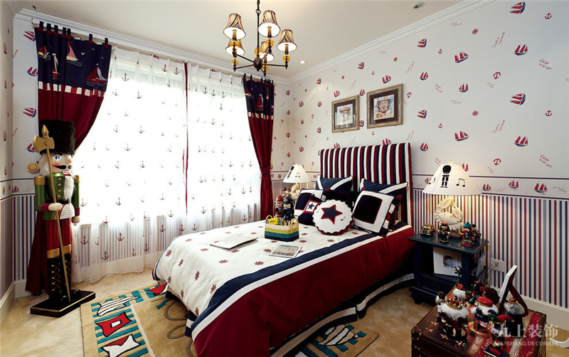 臥室墻紙圖案,窗簾圖案,床品圖案,都具海洋元素,色彩也十分搭配。