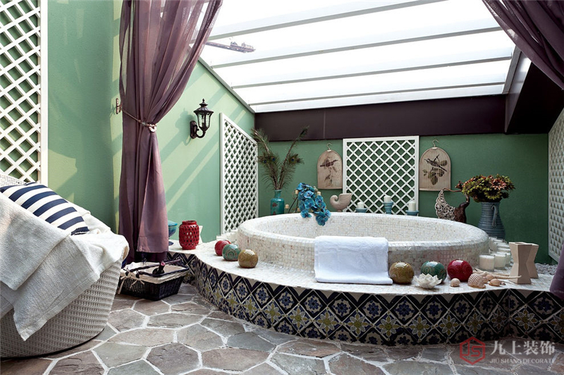 浴缸外觀形似一條大魚,擺件以各種海螺為主。
