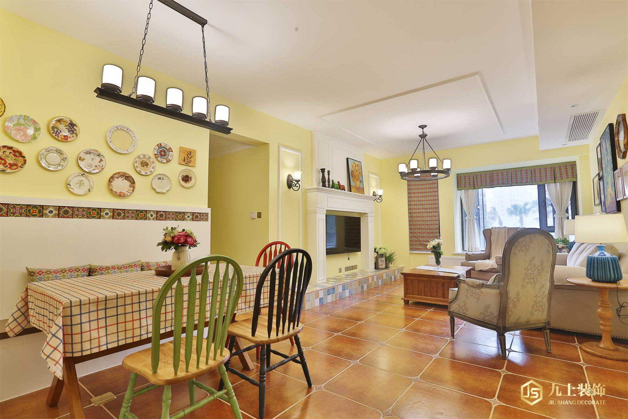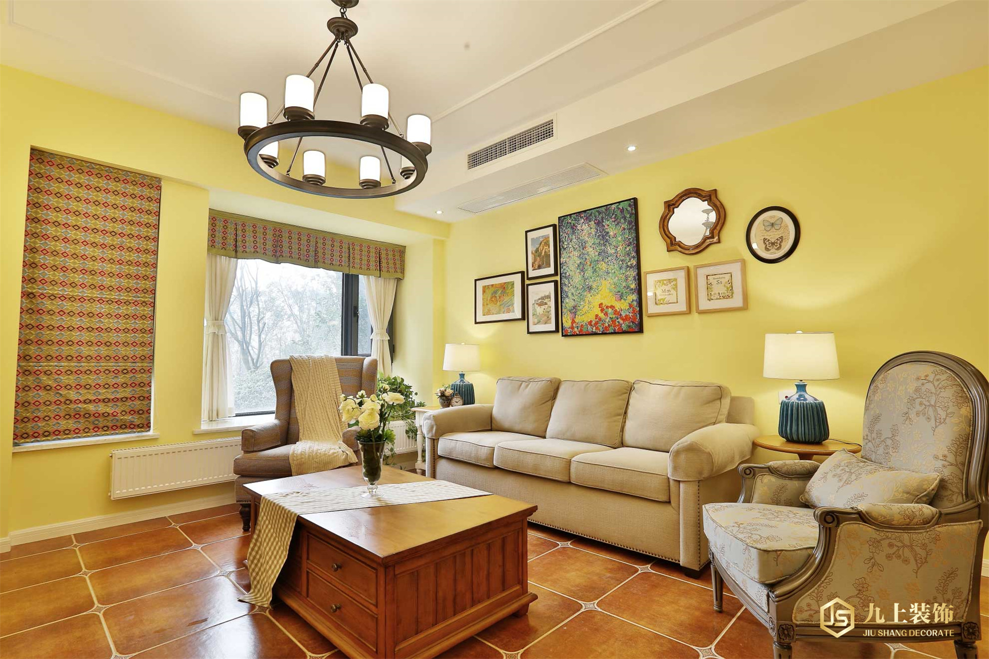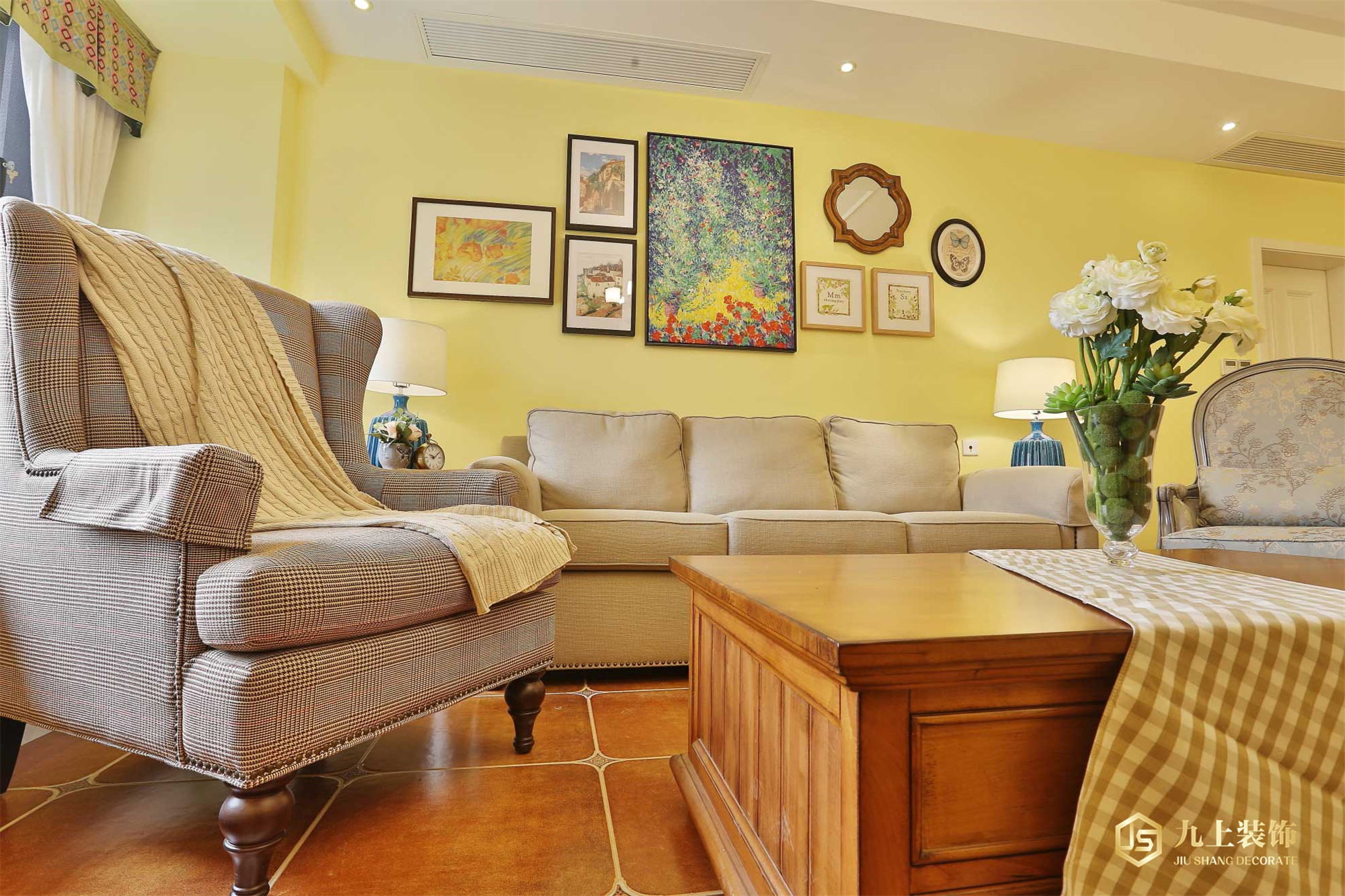 客廳作為待客區(qū)域,一般要求簡潔明快,同時裝修較其它空間要更明快光鮮,通常使用大量的石材和木飾面裝飾;美國人喜歡有歷史感的東西,這不僅反映在軟裝擺件上對仿古藝術(shù)品的喜愛,同時也反映在裝修上對各種仿古墻地磚、材的偏愛和對各種仿舊工藝的追求上??傮w而言,美式田園風(fēng)格的客廳是寬而富有歷史氣息的。