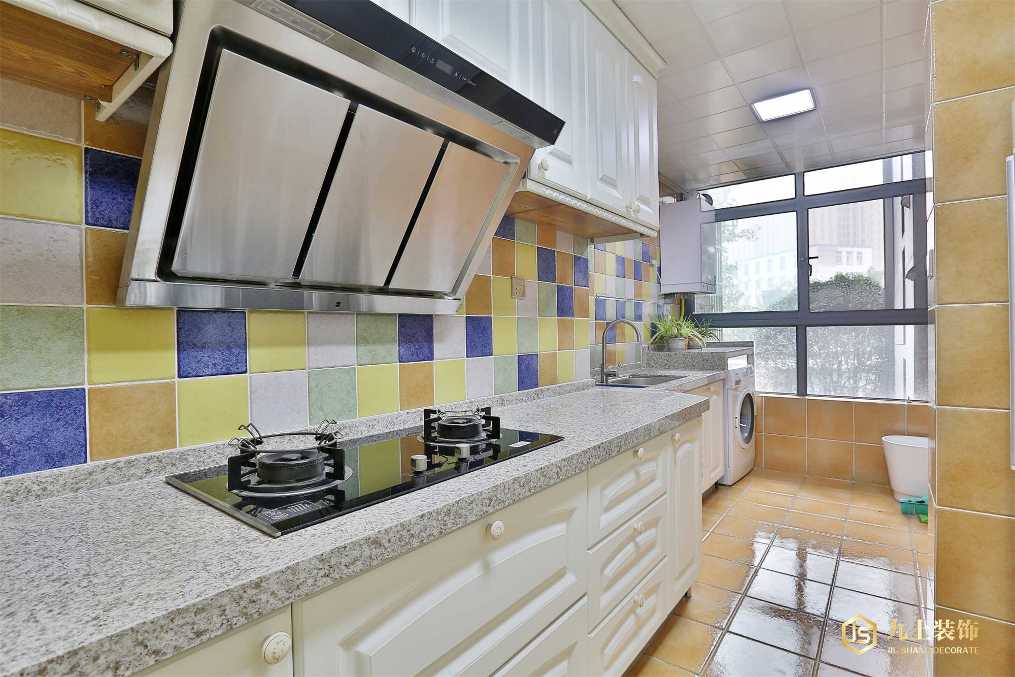 好仿古面的墻磚、櫥具門板喜好用實木門扇或是白色模壓門扇仿木紋色。另外,廚房的窗也喜歡配置窗簾等。