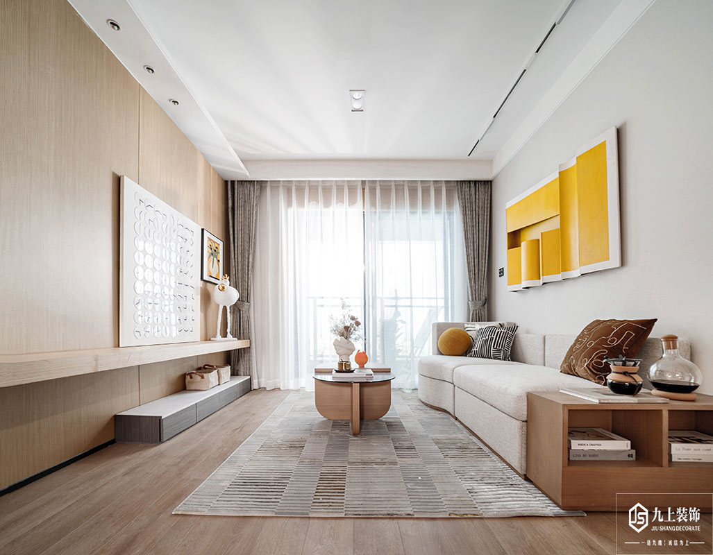客廳設計追求淡雅深邃的感覺,化繁為簡,擯棄過多的修飾,大面積原木色與白色結(jié)合,搭配清新自然、線條簡潔的家具,加上棕橙色點綴一二,符合無印良品原木極簡的生活特點。
