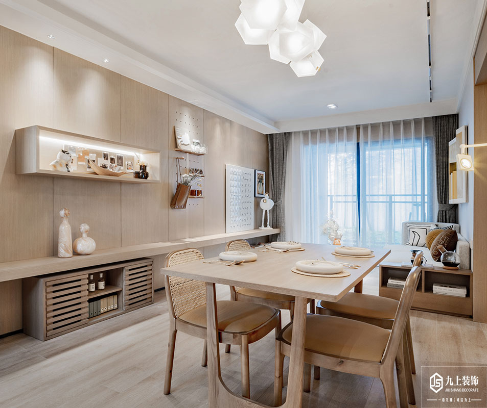 餐廳和客廳使用一體化設計,連為一個整體,視野開闊,餐桌、椅子均使用原木的材質(zhì),再搭配一抹綠植,透出幾分禪意。