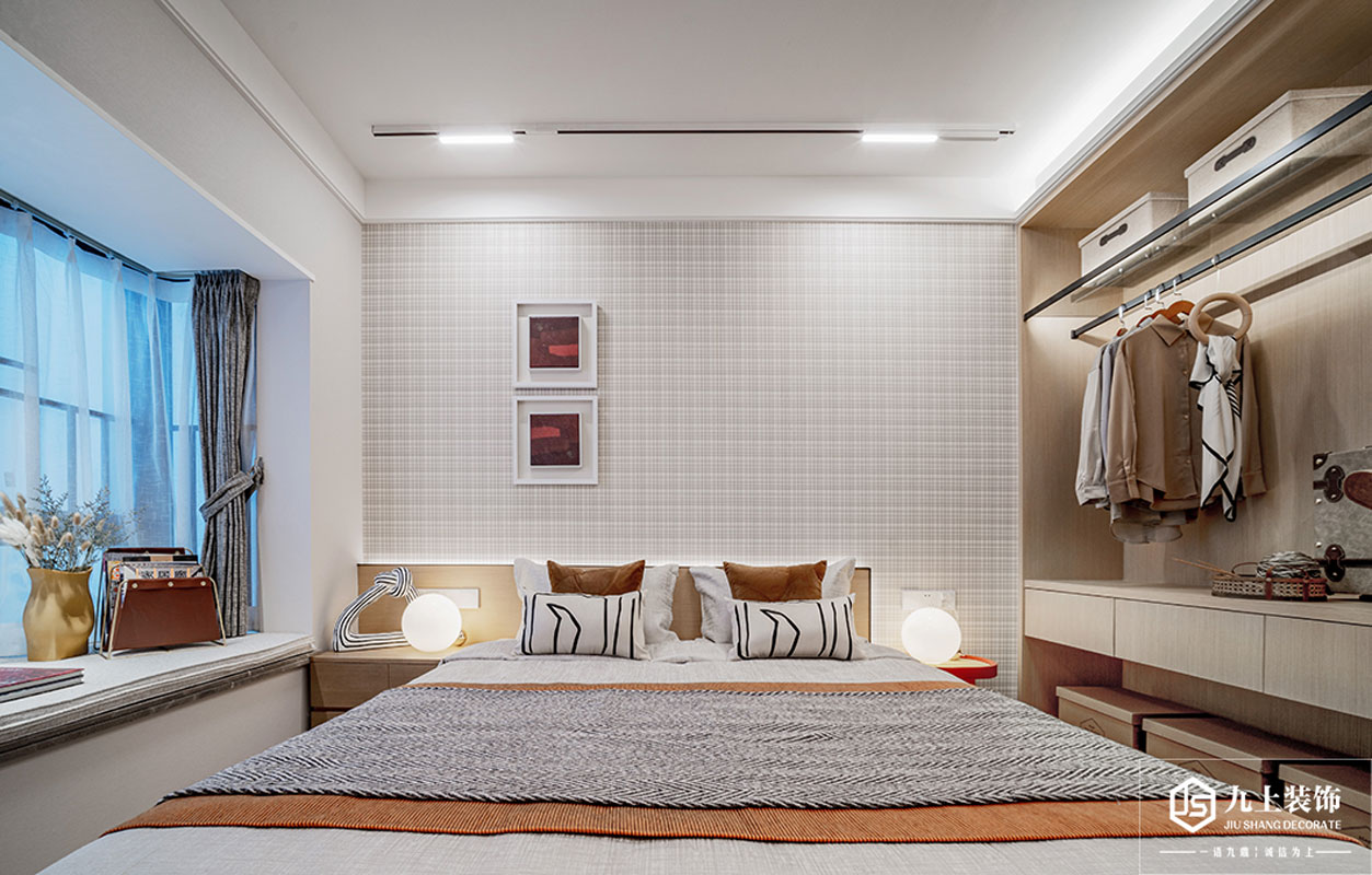 主臥延續(xù)典雅淺淡的基調(diào),大面積的原色木材延伸空間各處。