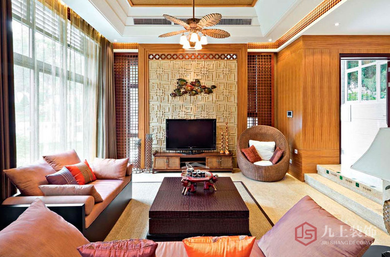 客廳以東南亞常見的紅棕色為主,實木材質(zhì),搭配淺色窗簾立體電視墻和布藝沙發(fā),熱帶元素,大氣而又不沉悶。