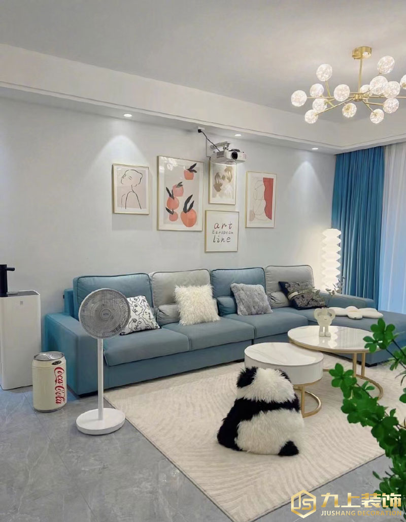 天藍色的沙發(fā)和窗簾呼應(yīng),配以紅色掛畫點綴