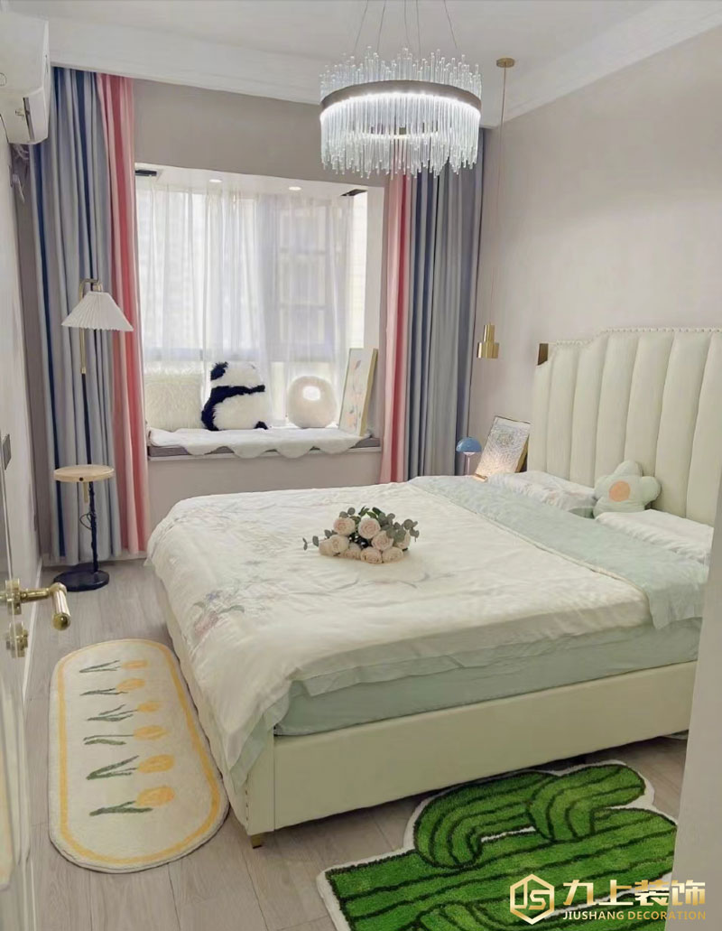 主臥以白色主,窗簾用藍紅拼色,加綠色地墊點綴