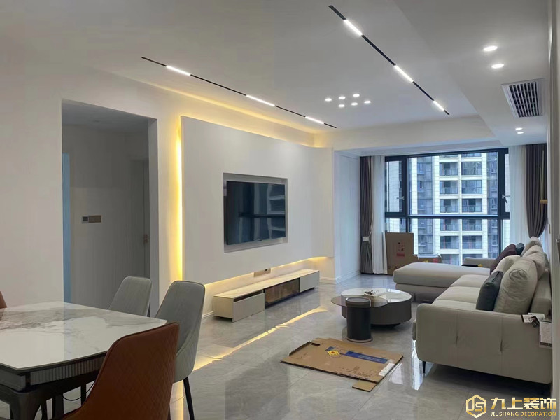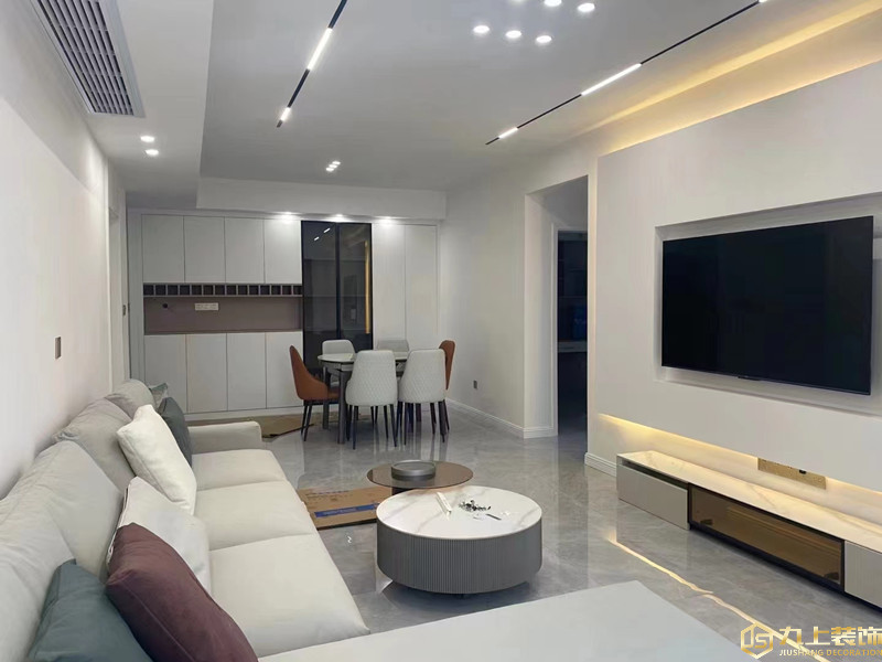 客廳主要以極簡為主,無主燈的吊頂,簡單的電視墻,搭配灰色系的沙發(fā),簡約而不簡單。
