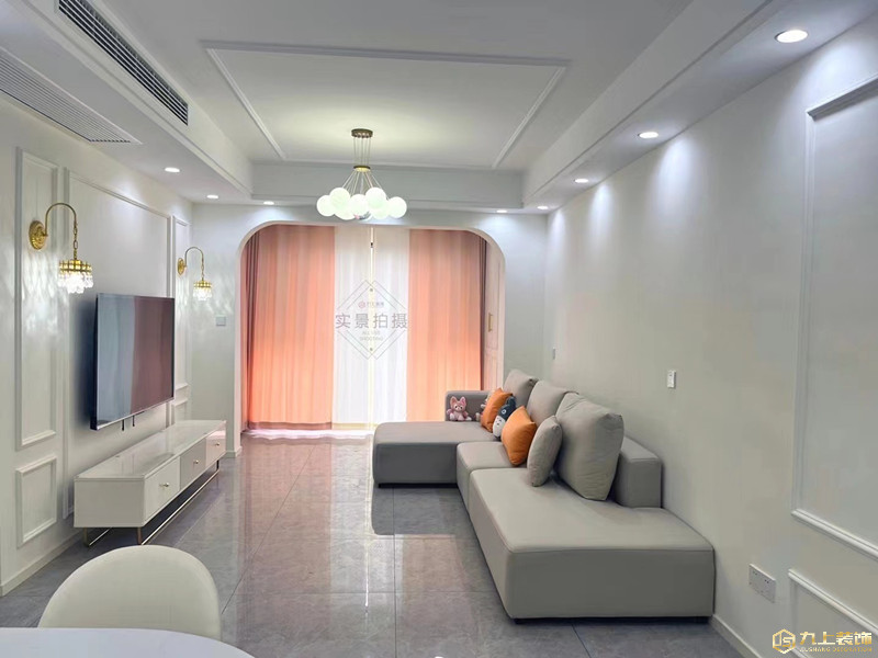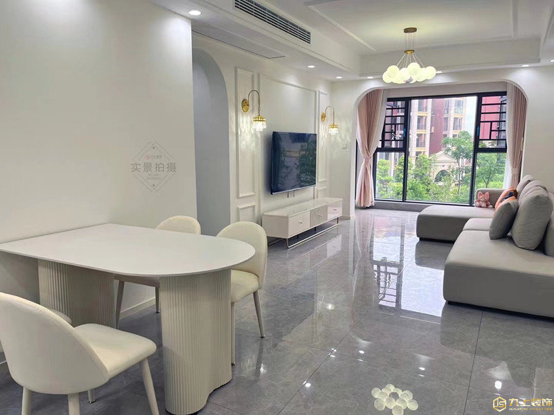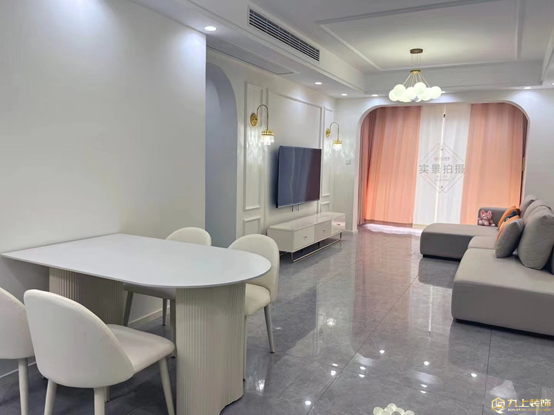 整個客餐廳做的雙眼皮吊頂,加上奶油風(fēng)的燈具,給人一種溫馨的感覺。