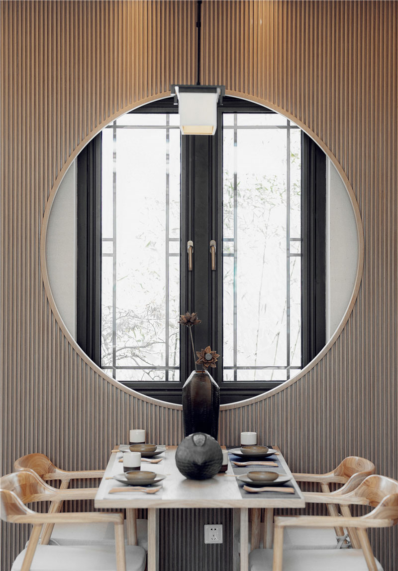 餐廳窗戶采用借景手法,別具一番韻味。圓的造型窗與電視背景墻上裝飾品相呼應(yīng),軟裝搭配草編吊燈。