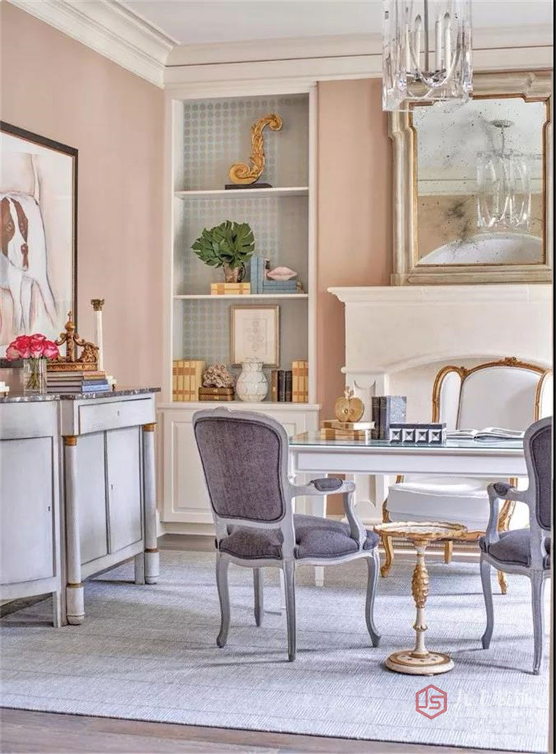 淡丁香色和暗粉色有著截然不同的表現(xiàn)力,前者清新高雅而充滿藝術(shù)魅力,后者濃郁散發(fā)成熟的韻味。這兩種顏色之間的交融,搭配上金色裝飾,并以深沉的墨黑點(diǎn)綴,帶來極具視覺張力的震撼。更不要忽視蒸汽灰在空間里凝聚的幽雅成分,它為色彩之間的聯(lián)結(jié)做到了完美銜接。