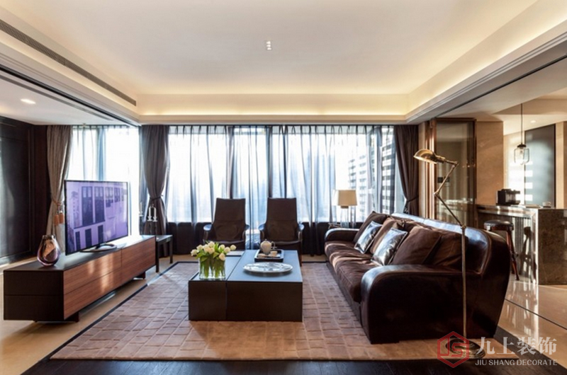 客廳地磚花飾多樣,深色系的皮革沙發(fā)給人厚重感,表達出主人的的成熟和品位。