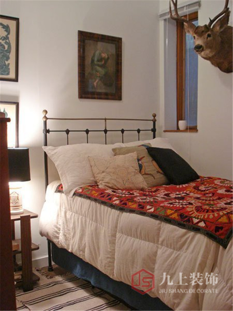 簡(jiǎn)單的鐵藝線條勾勒出簡(jiǎn)約的床,墻上擺上美式裝飾畫和西部牛頭飾品,仿佛看到當(dāng)年的西部景象