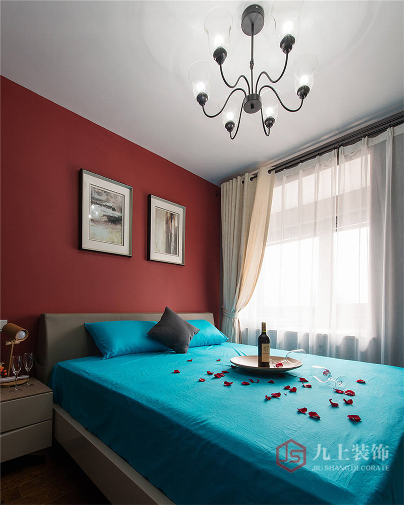 主臥用紅色墻與床單強(qiáng)烈對(duì)比,制造出強(qiáng)烈的視覺沖擊效果。