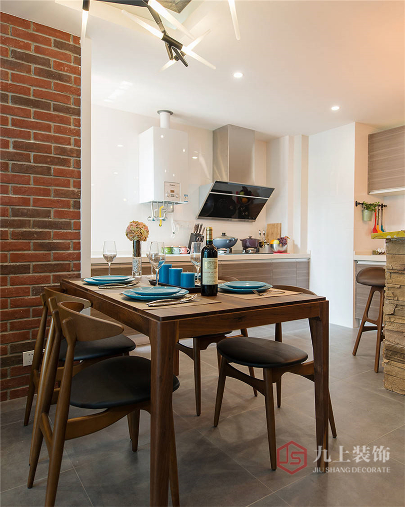 實(shí)木沙發(fā),工業(yè)墻,布藝沙發(fā),淺藍(lán)色窗簾,強(qiáng)烈的顏色對(duì)撞,撞出了小宇宙的爆發(fā),混搭出不一樣的風(fēng)土人情。