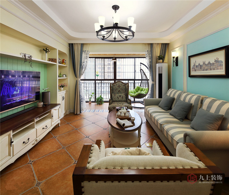 客廳與陽臺的推拉門拆除,將陽臺封閉,融入到客廳的空間,延伸了空間感,陽臺也定義為是休閑觀景之處。電視背景的處理相對簡單,淡藍色的護墻板,結(jié)合組合柜的表現(xiàn)方式來滿足客戶對儲物空間的一再要求