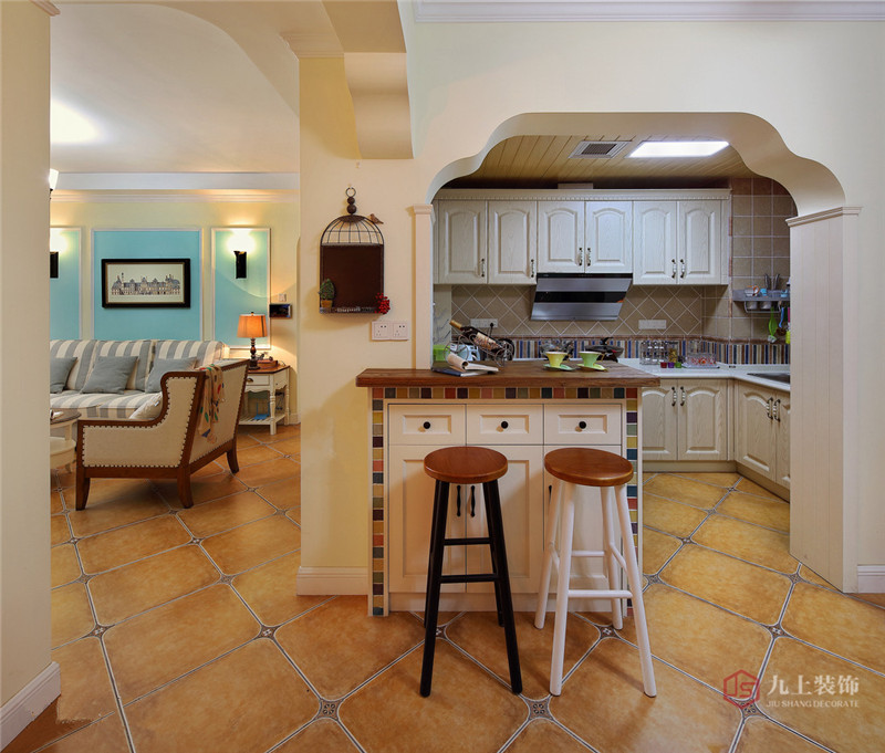 將廚房做成了半開式空間,也采用了淺色的櫥柜和仿古磚。半開放式的廚房與餐廳之間加設(shè)了一個吧臺,顯得廚房空間大了許多,小吧臺的設(shè)計,彩色馬賽克的點綴,成為了亮點