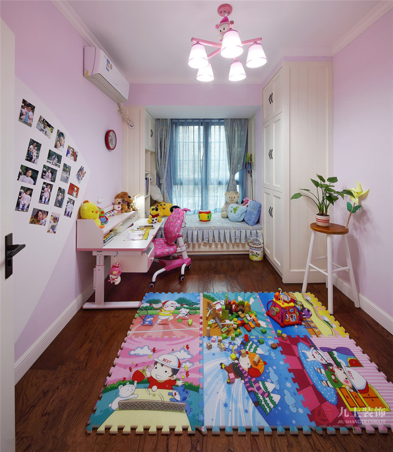 兒童房利用飄窗延伸做榻榻米設(shè)計;兩側(cè)及下面均設(shè)有儲物空間,增加收納功能兒童游樂