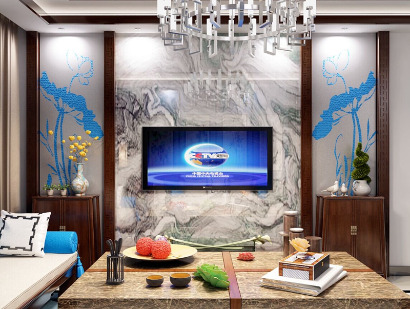 客廳效果圖最具代表性的裝飾主要體現(xiàn)在電視背景墻的造型處理上,主要運用了中式風格中的傳統(tǒng)角花和中式花格裝飾。