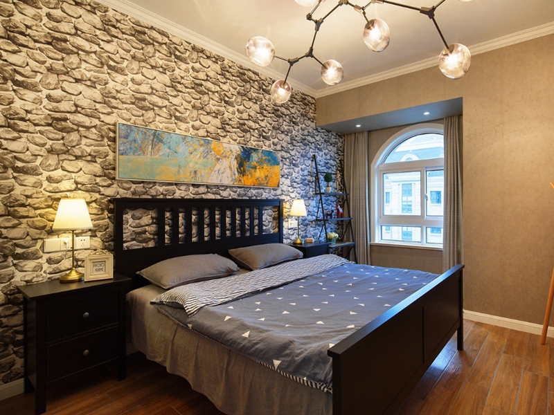 臥室設(shè)計的也很有藝術(shù)感,鵝卵石壁紙給這個臥室?guī)硪唤z清涼......