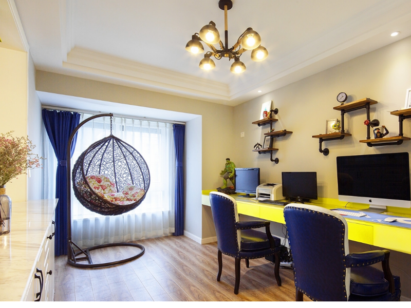書房也是開放式的,在客廳一角,獨立成一個空間,懶人沙發(fā)的設(shè)置,讓這個空間辦公、休閑一體化。