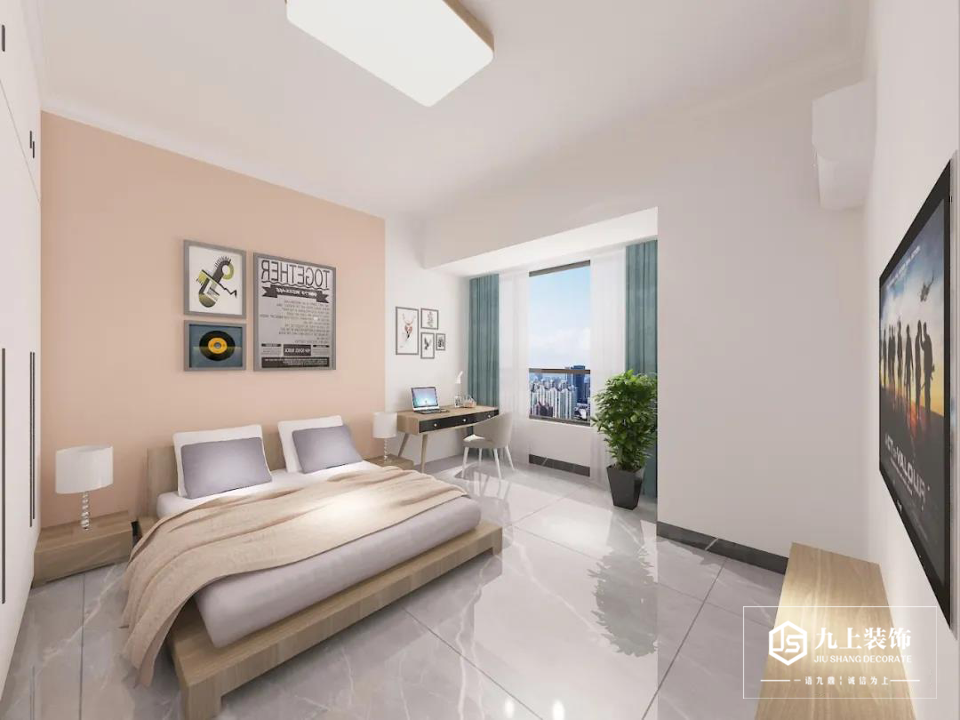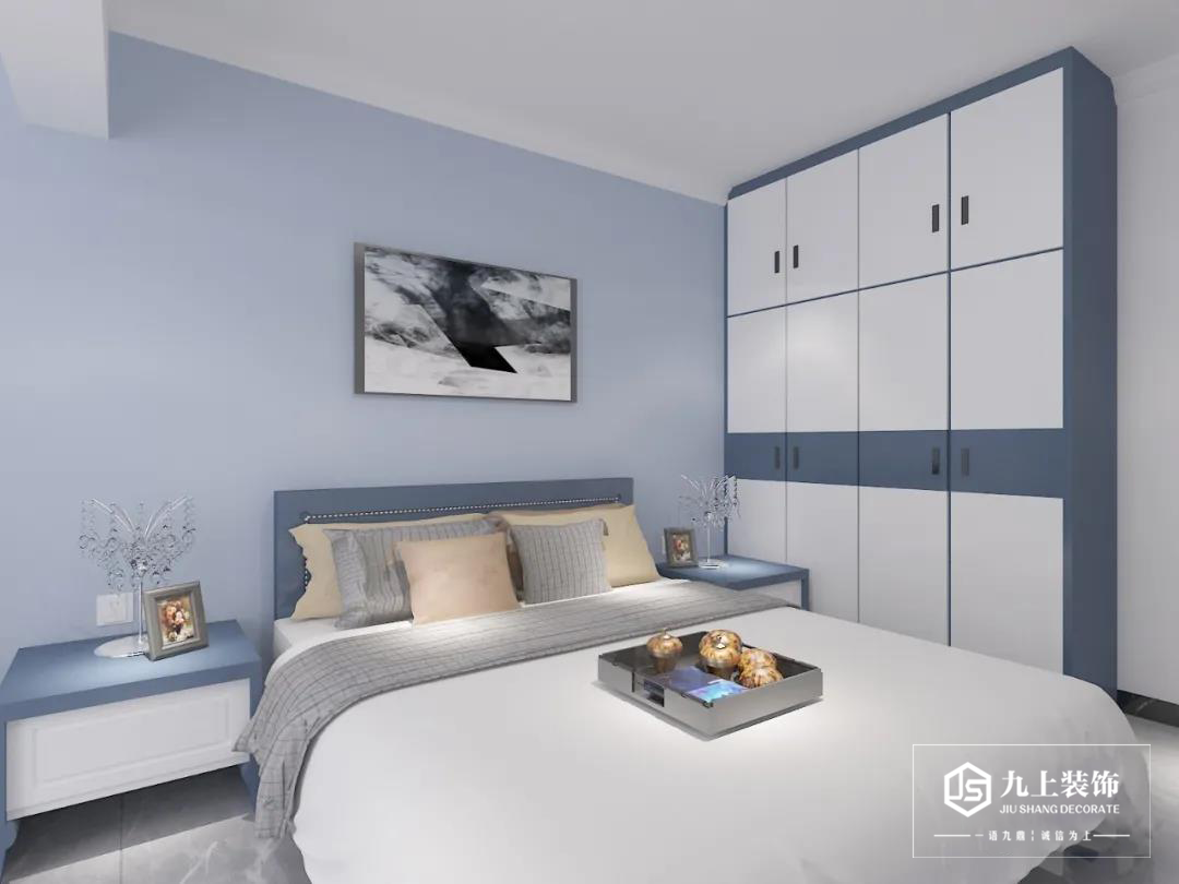男孩房以霧藍色為主,定制柜子+陽臺書桌,寬敞明亮的光線,擁有不一樣的小精彩。
