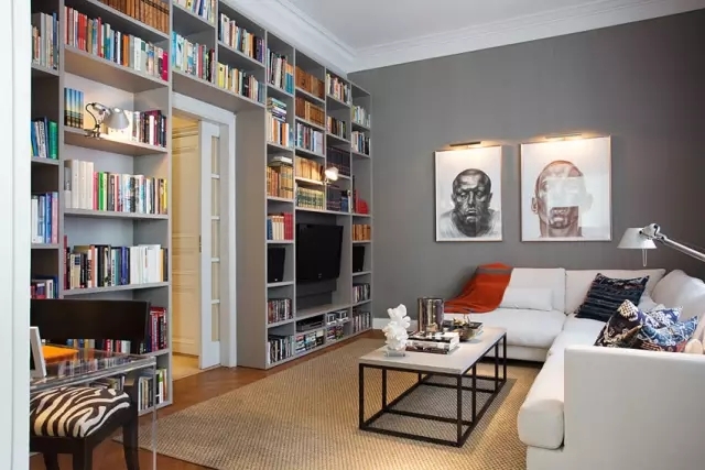客廳做一個(gè)整面墻的書架,讓客廳具有了會(huì)客聊天+讀書寫字的功能,這個(gè)家的核心地帶則不僅有溫馨的居家感,還有了書卷氣的高格調(diào)。