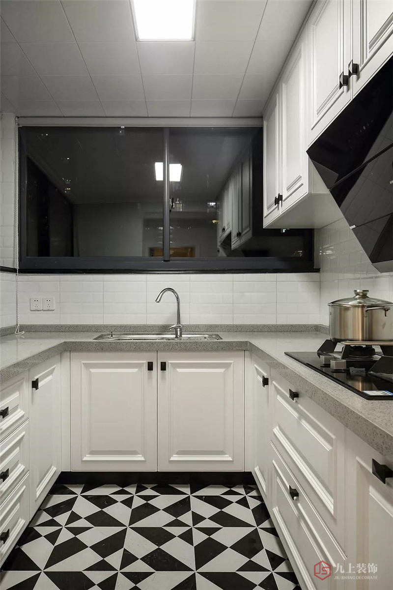 廚房間屬于狹長型,利用率極低,U型的設計,提高的利用率,收納空間很充足。