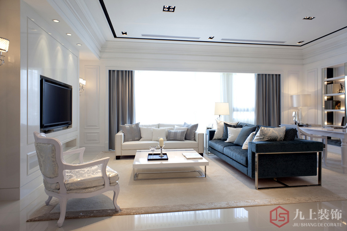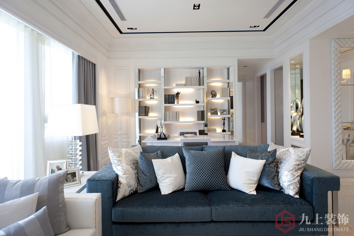 簡(jiǎn)歐風(fēng)格客廳裝修設(shè)計(jì)主色調(diào)為白色,搭配湖藍(lán)的沙發(fā),很休閑舒適。