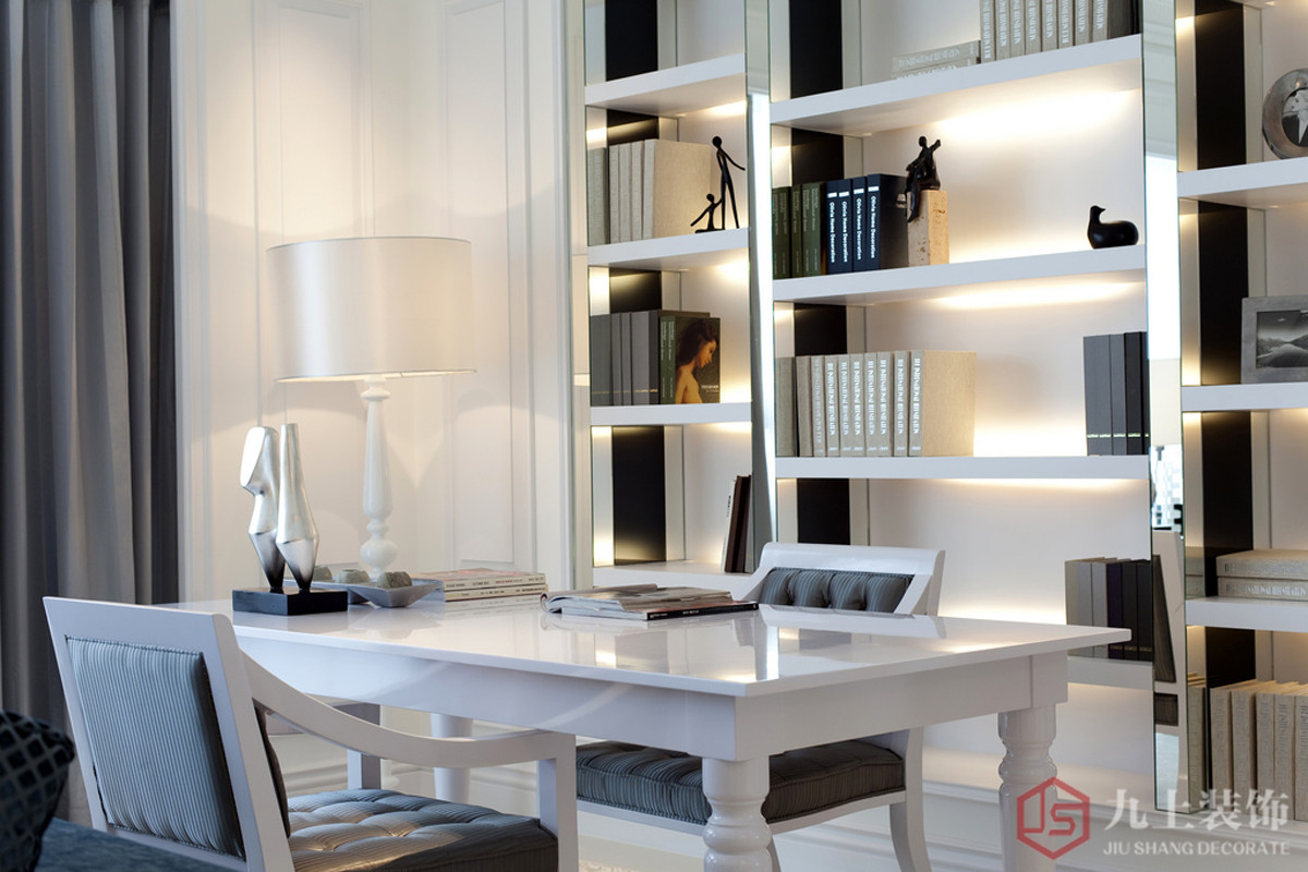 簡(jiǎn)歐風(fēng)格書(shū)房裝修設(shè)計(jì)在家具則是白色或深色都可以,但是要成系列,風(fēng)格統(tǒng)一為上。