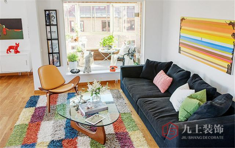 客廳采用彩虹色壁畫和彩色地毯相呼應(yīng),橙色木制創(chuàng)意茶幾和椅子,糖果色讓室內(nèi)充滿活力。陽(yáng)臺(tái)簡(jiǎn)約風(fēng)使室內(nèi)更加明亮。
