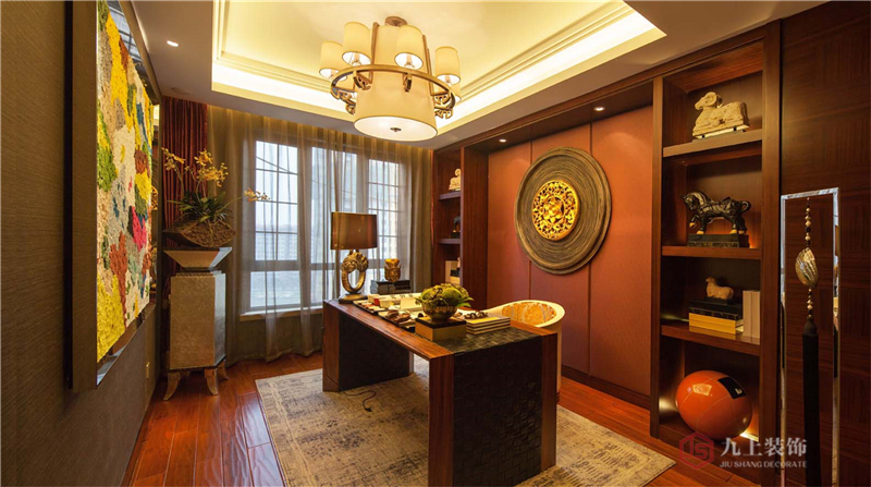 書房以不同深淺的木色為主,看著有層次感,擺設(shè)物件也充滿藝術(shù)氣息,穩(wěn)重儒雅的視覺享受。