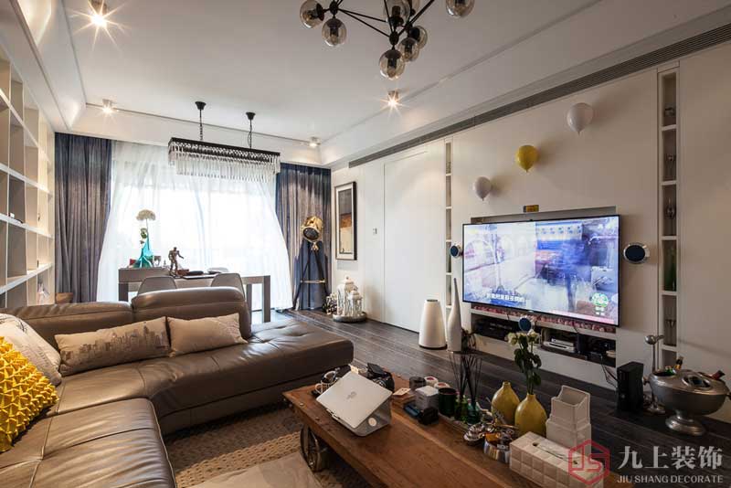 電視機設(shè)備和儲物空間的巧妙搭配。