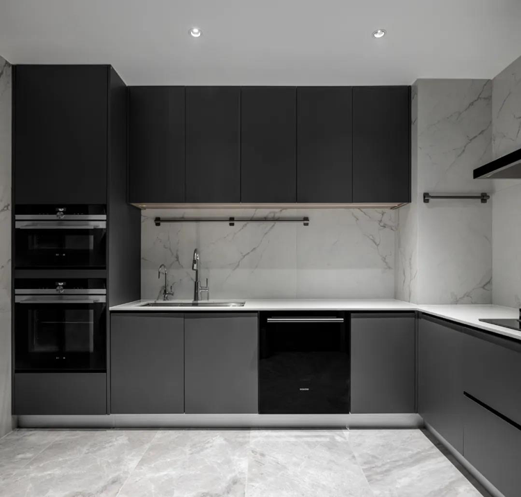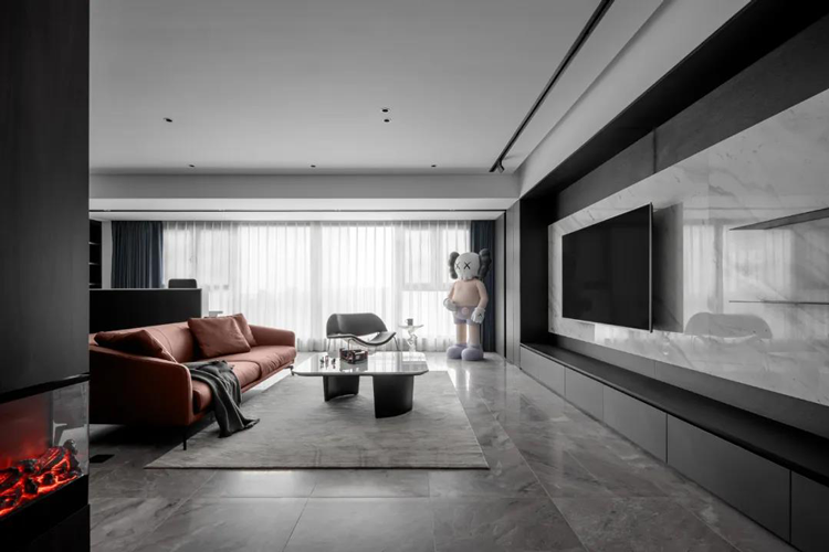 整體采用柔光云灰色地磚進行鋪貼,讓公共區(qū)域簡潔有力的同時更有高級感,理石材質(zhì)與黑色護墻板進行疊層搭配,用基礎(chǔ)的線面組合釋放無限的空間思維,在視野上延伸寬度與深邃感,底部的收納柜放置屋主未開封的手辦使用。