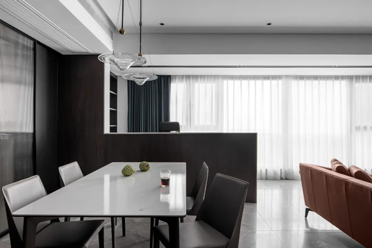 魚線型玻璃吊燈,光影曼妙靈動,讓餐廳呈現(xiàn)影影綽綽的朦朧之美,寬闊的空間不僅能兩人同時,并且可與客廳、餐廳保持視野的流暢溝通。
