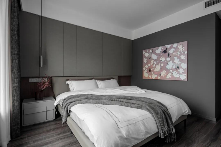 主臥由于收納空間不足,所以調(diào)整了衛(wèi)生間與臥室之間的距離,整體風格去掉過于硬朗的黑色,延續(xù)灰調(diào),搭配柔和的粉色,氛圍兼具優(yōu)雅與浪漫,打造別樣夢境。