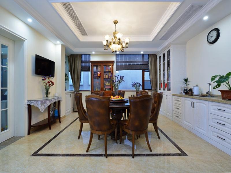 餐廳作為用餐區(qū),保證滿足家人用餐之時,古樸的實木餐桌椅,椅子與桌子邊緣一般都有一定的雕刻和弧度,典型的美式風格。
