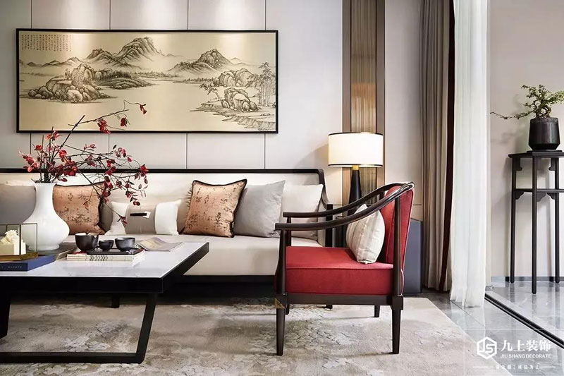 沙發(fā)墻在硬包背景墻的基礎(chǔ),掛上一幅江山景色的裝飾畫(huà),布置禪意優(yōu)雅的沙發(fā)、茶幾與休閑椅,布置意韻十足的花瓶插花、茶具等細(xì)節(jié)裝飾,帶來(lái)一個(gè)詩(shī)意穩(wěn)重的端莊與高檔感。