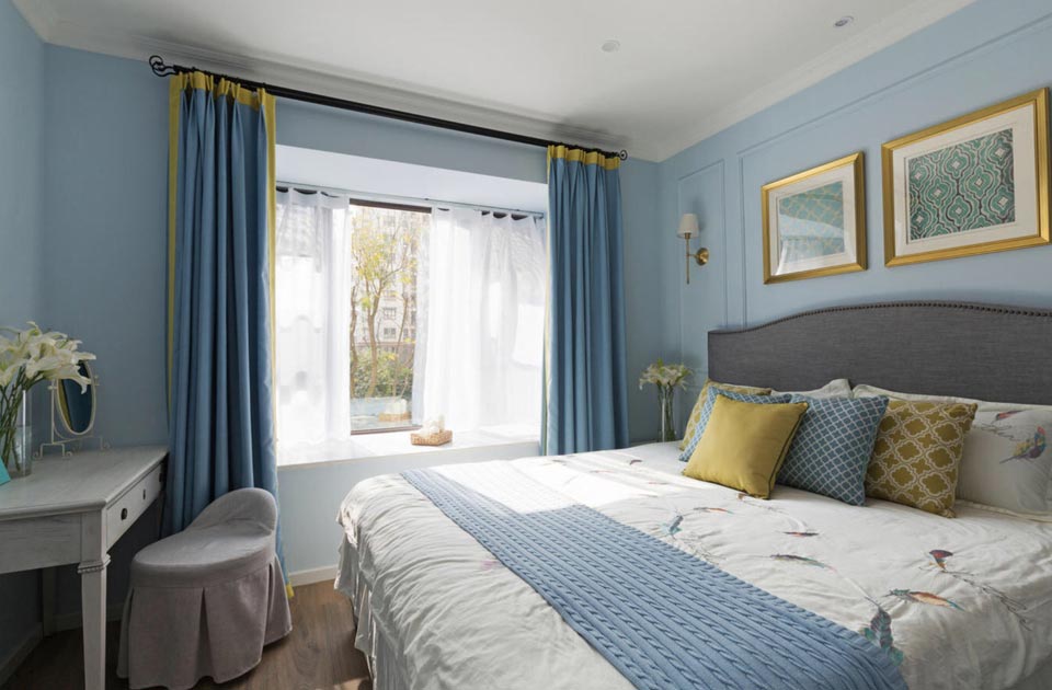 九上裝飾-在輕柔的硬裝空間里,硬裝色彩弱化,通過軟裝藍(lán)色做為主色調(diào)貫穿。寧靜平和并不等同于枯燥乏味。