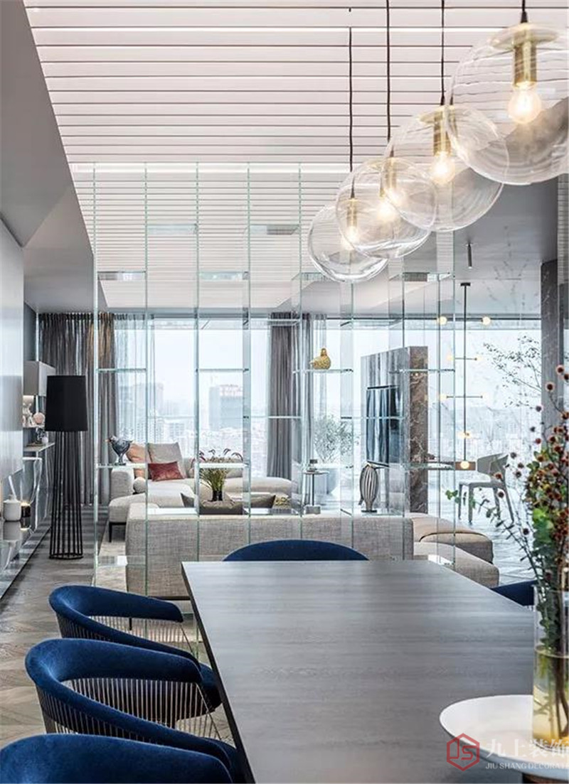 餐廳-用餐區(qū)由透明的玻璃書架與客廳的沙發(fā)區(qū)隔開,在視覺上構(gòu)成了一個連續(xù)的記憶空間。