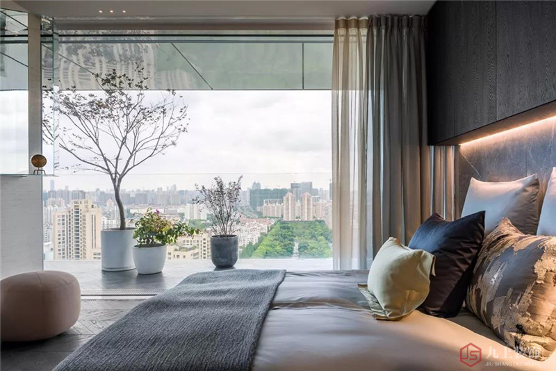 起居室旁邊落地式廚房延伸到整個公寓的最底部,與此同時,北側(cè)的陽臺穿過公寓內(nèi)部一直延伸到了另一邊的地平線,不同功能空間有機的連接起來,公寓內(nèi)沒有任何東西擋住住客的視線。彩色鋁板天花與簡約時尚的吊燈相結(jié)合,為包括起居室和廚房在內(nèi)的整個休息、用餐區(qū)創(chuàng)造了一個舒適又溫馨的氛圍。